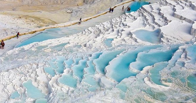 🏞️ Pamukkale Terasları: ikonik beyaz travertenlerde çıplak ayakla yürüyün ve inanılmaz manzaraların tadını çıkarın.